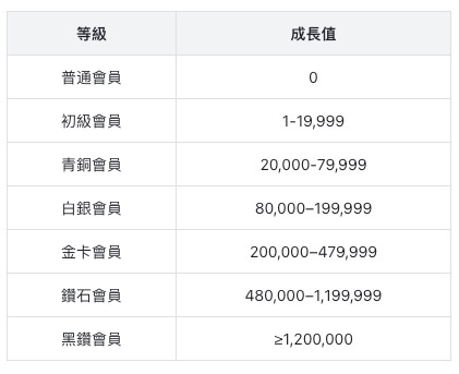 會員可透過每月消費累積成長值,系統將依據成長值表現判定會員等級。